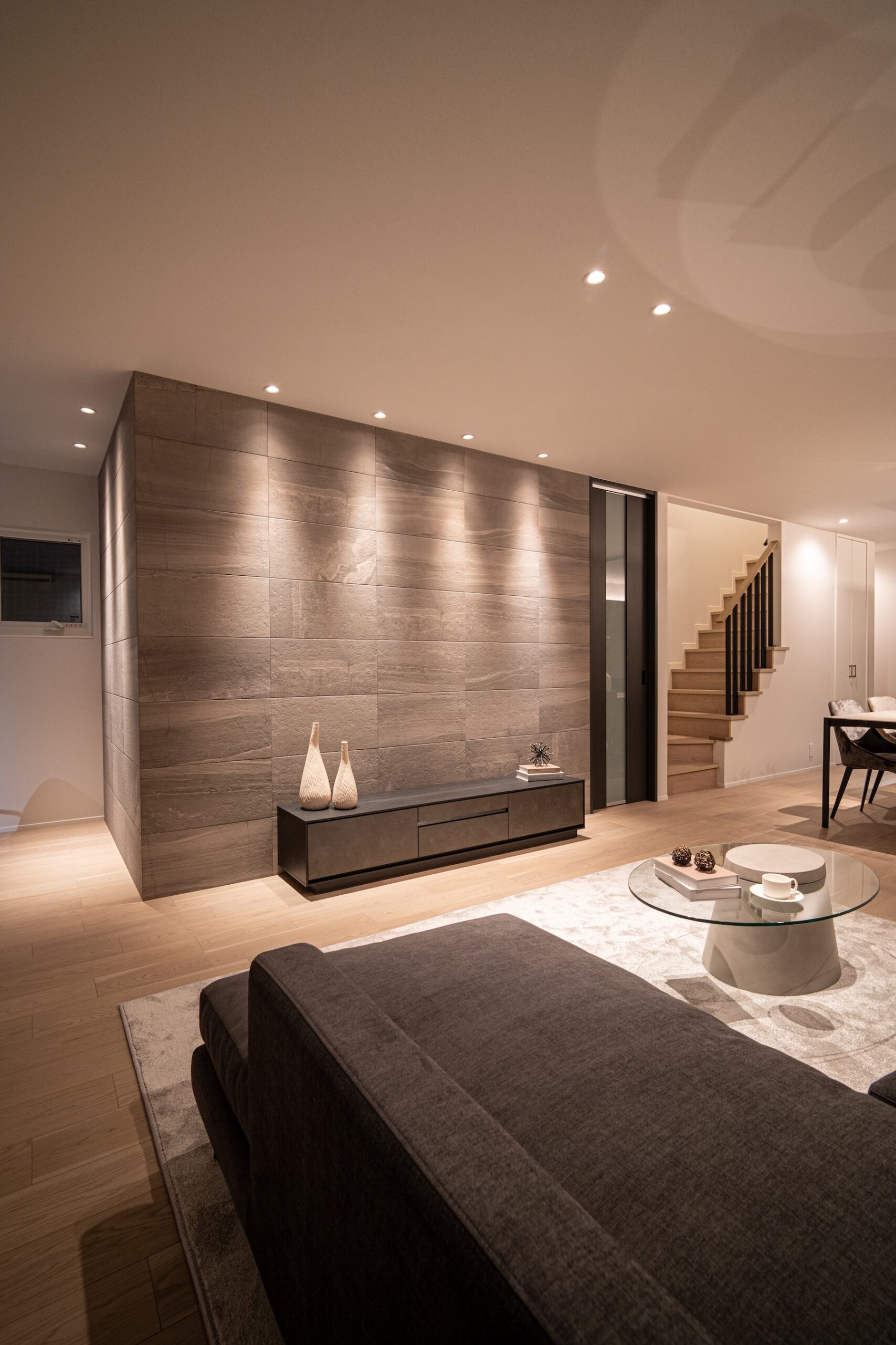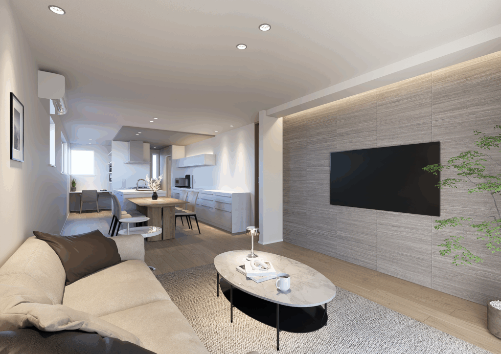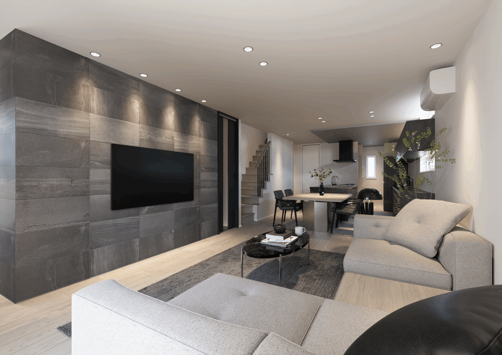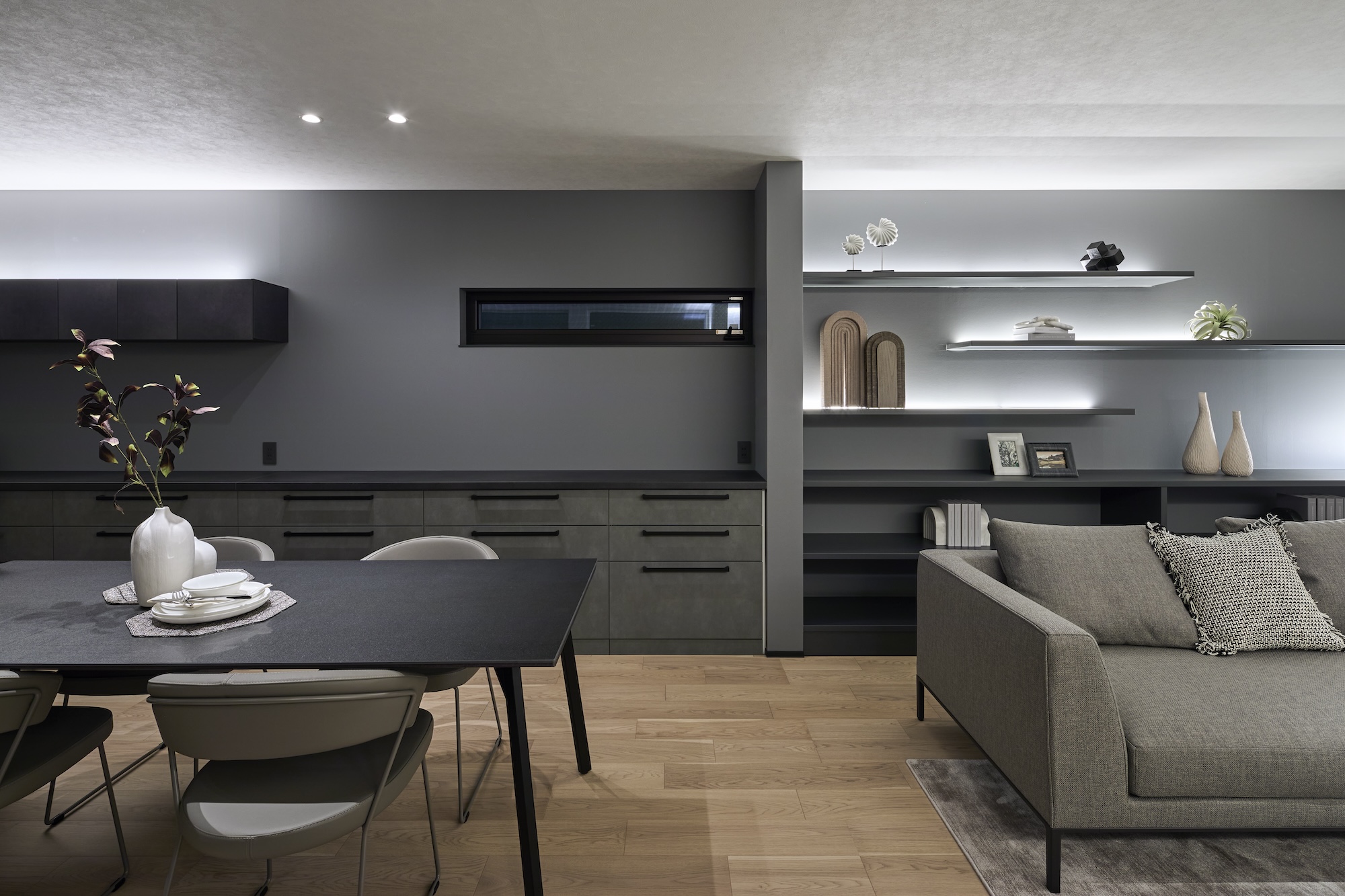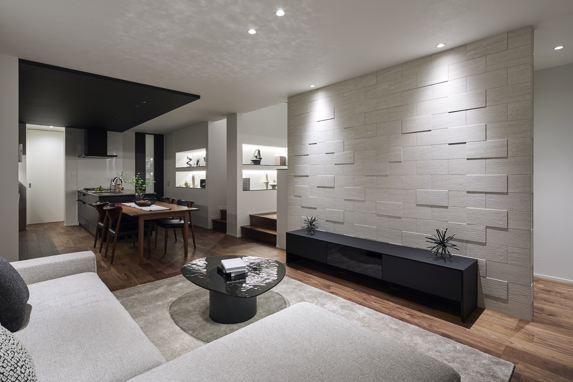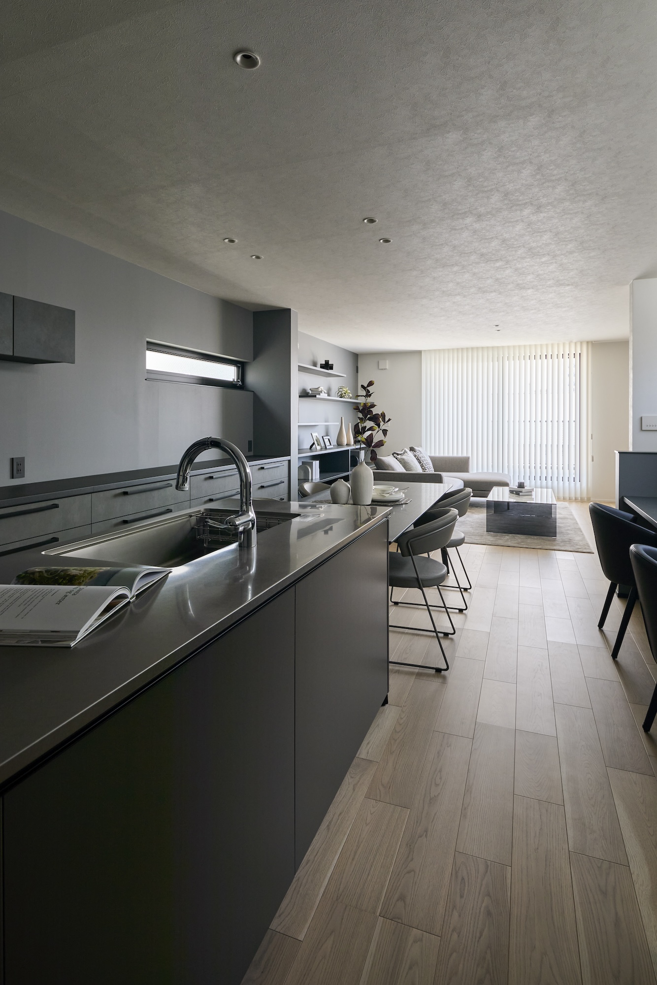 柔らかな自然光が差し込むリビングは、質感豊かな壁面と調和し、ハイセンスな大人の憩いの場を演出します。機能性とデザインを両立させたオープンキッチンは、家族やゲストとの会話を途切れさせない心地よい設計。