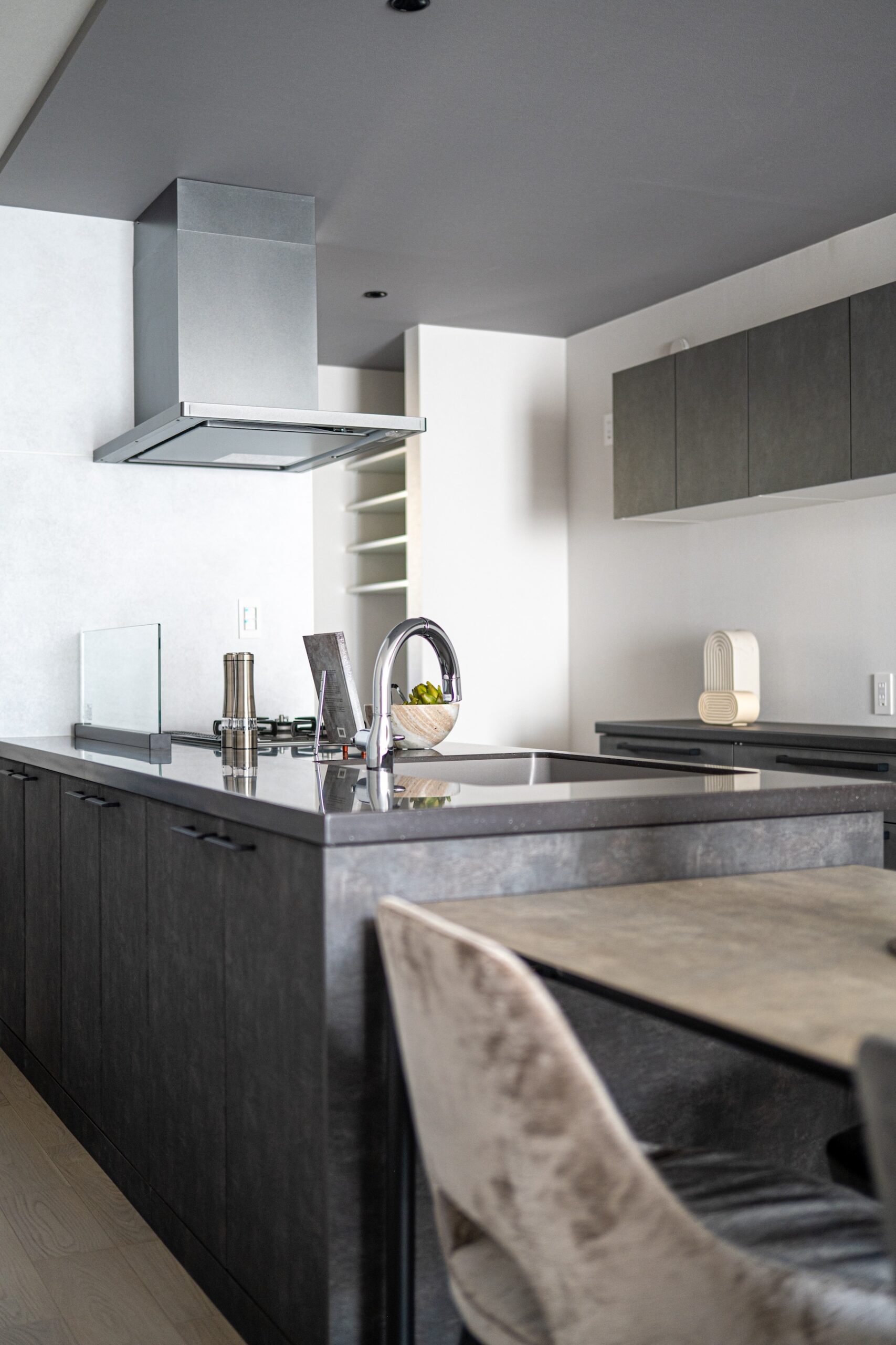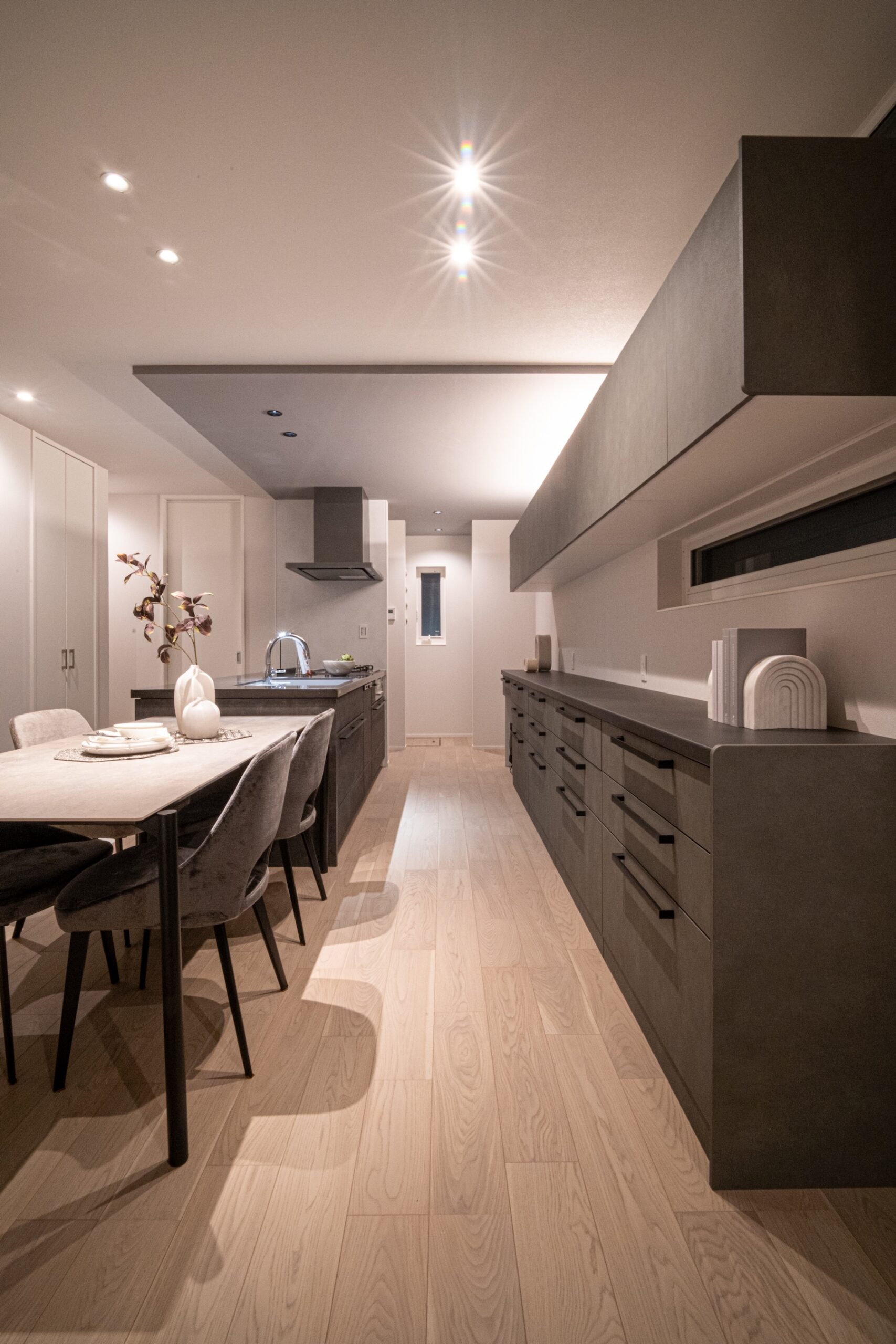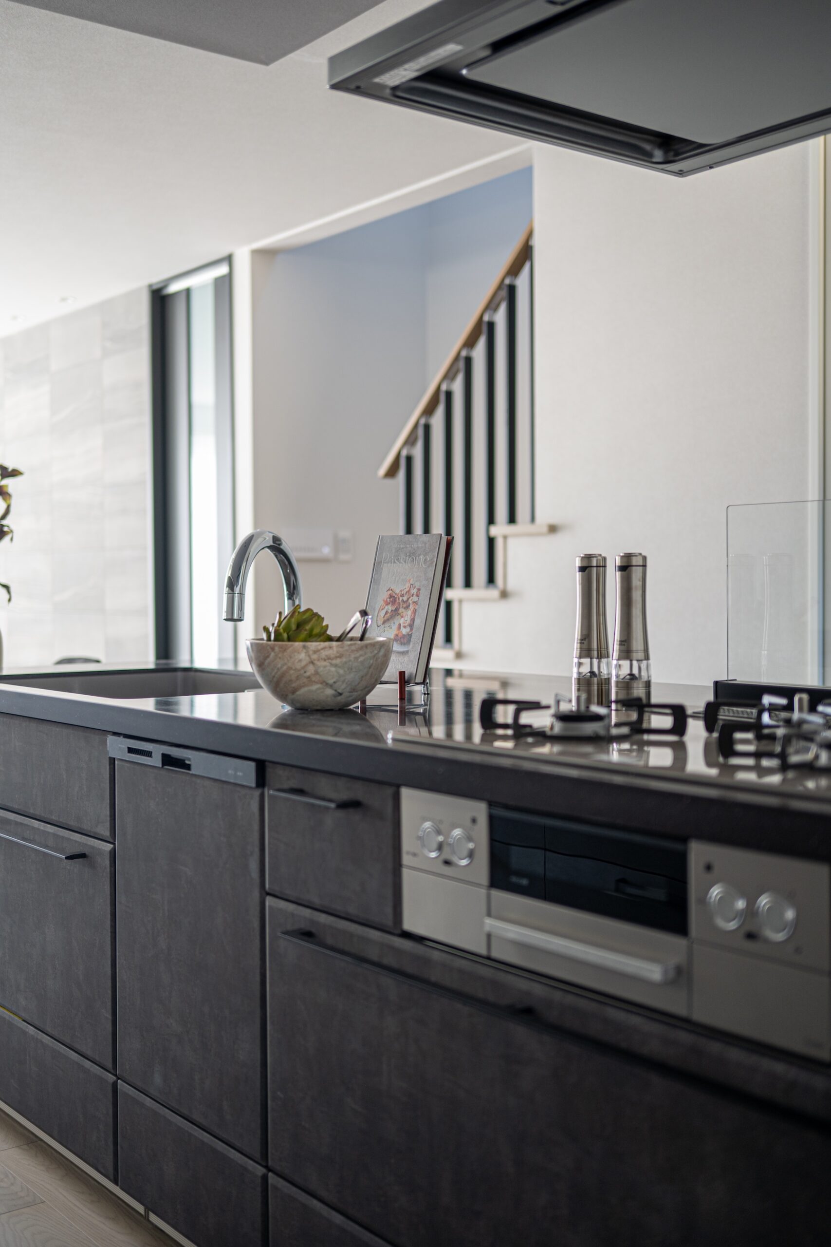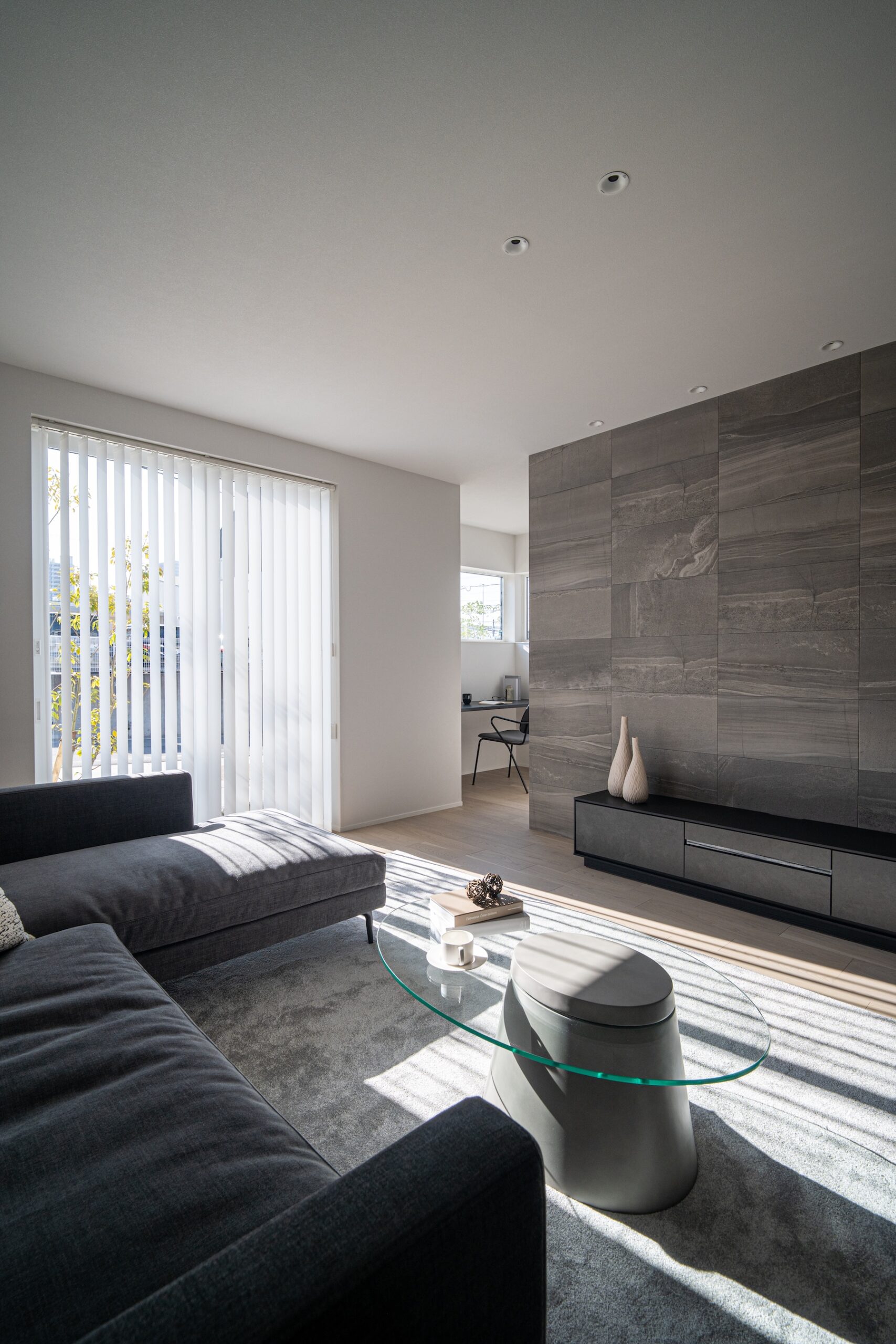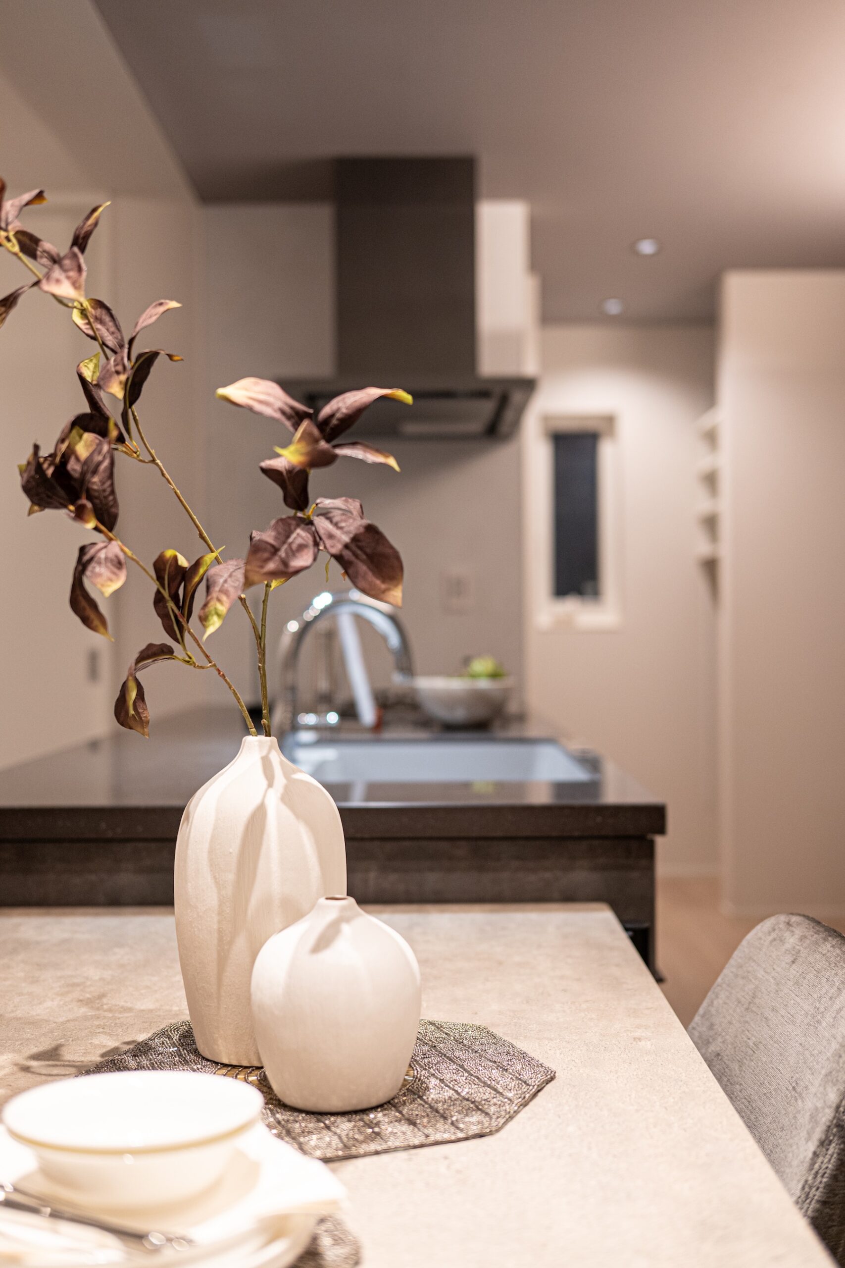 柔らかな自然光が差し込むリビングは、質感豊かな壁面と調和し、ハイセンスな大人の憩いの場を演出します。機能性とデザインを両立させたオープンキッチンは、家族やゲストとの会話を途切れさせない心地よい設計。