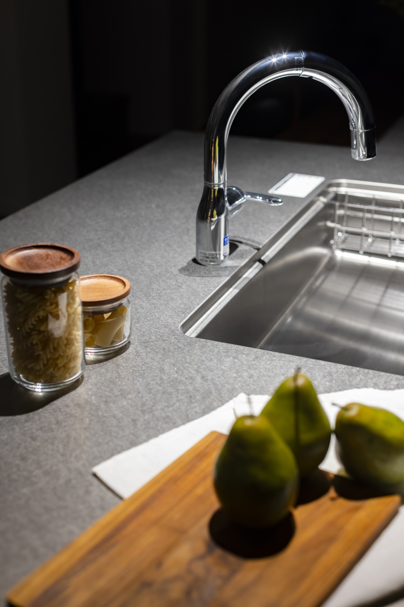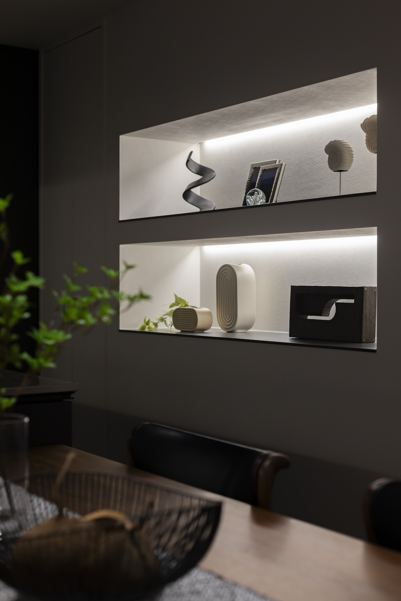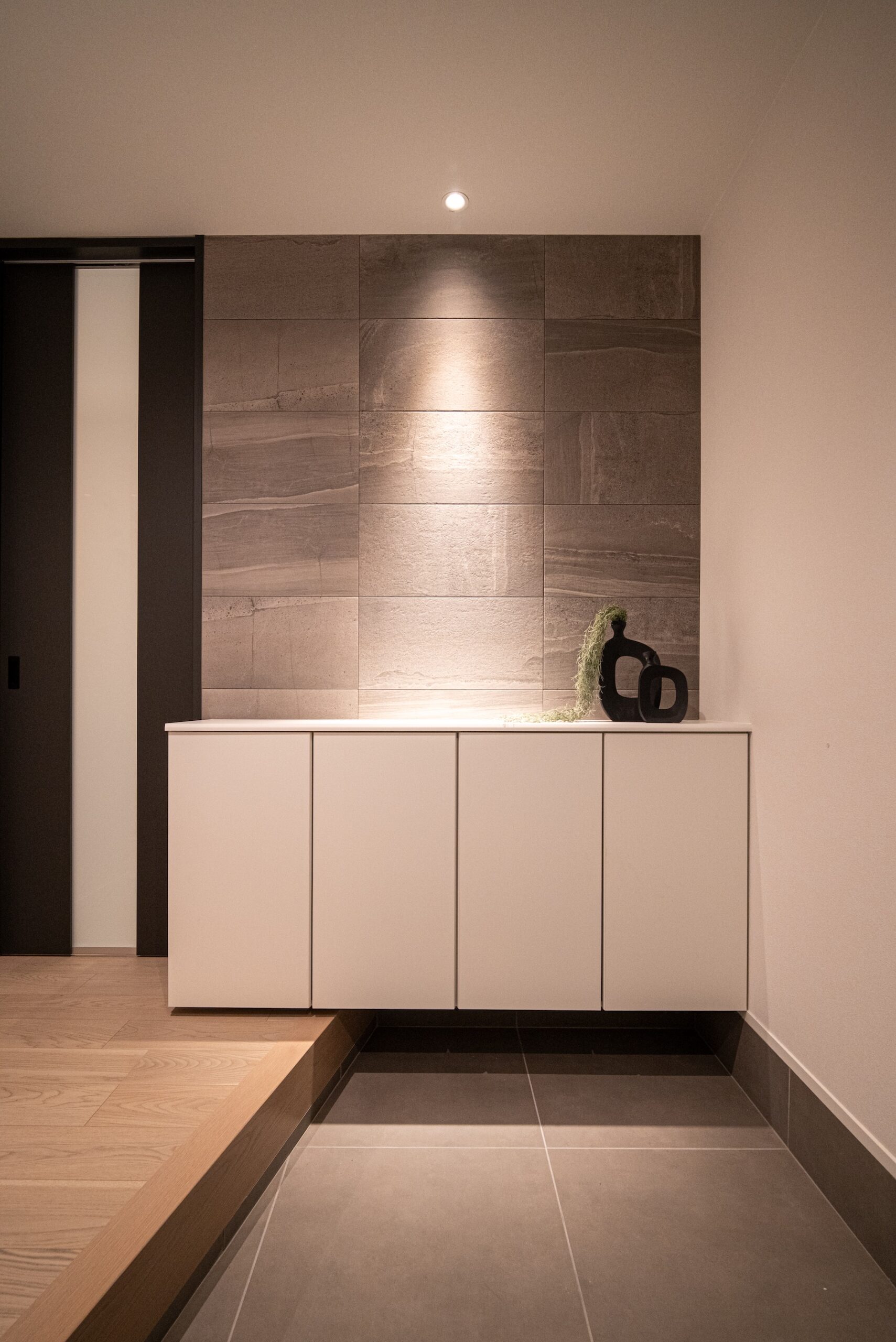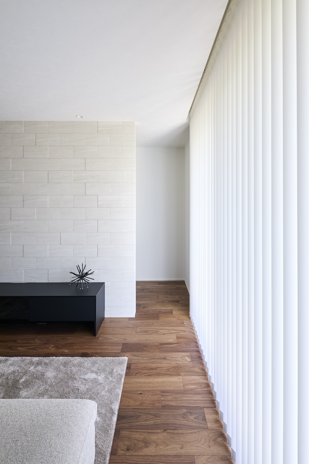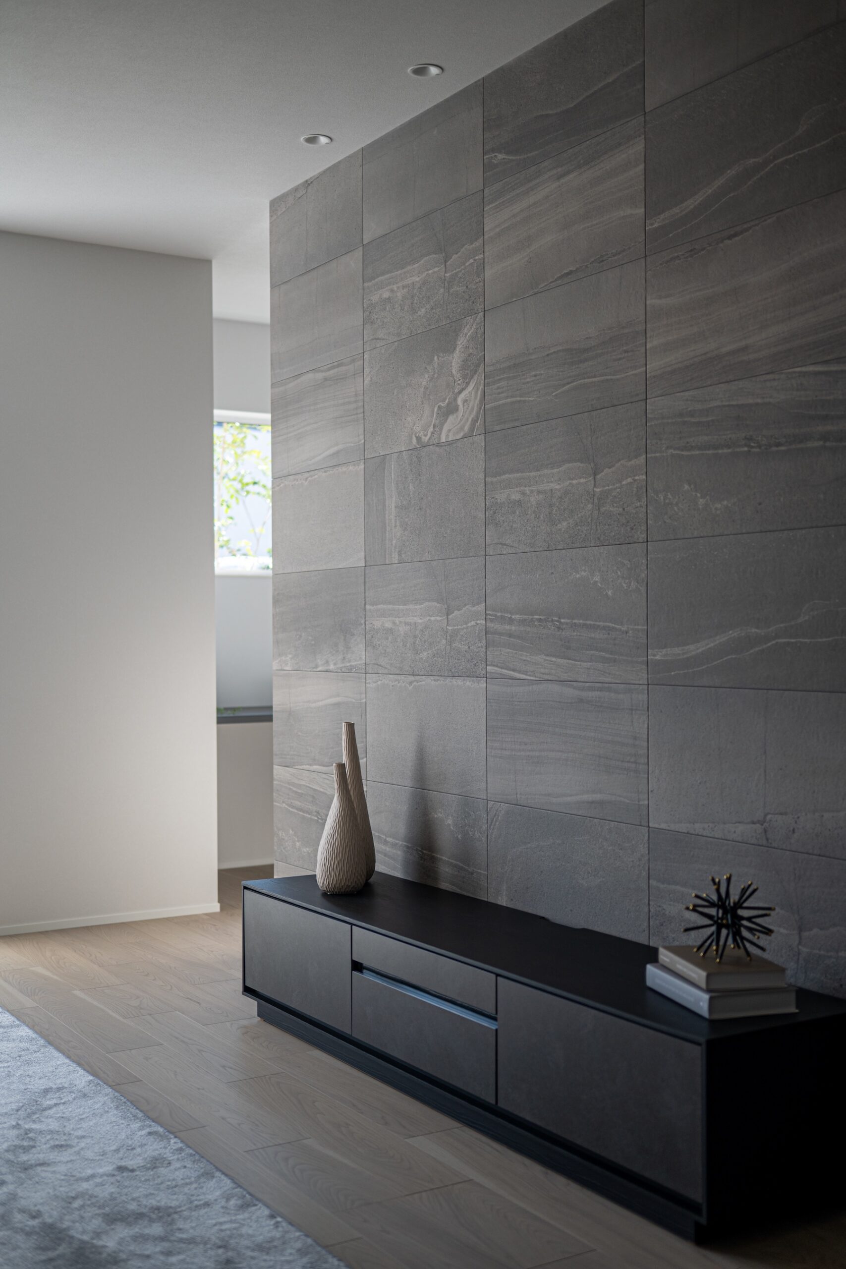 柔らかな自然光が差し込むリビングは、質感豊かな壁面と調和し、ハイセンスな大人の憩いの場を演出します。機能性とデザインを両立させたオープンキッチンは、家族やゲストとの会話を途切れさせない心地よい設計。