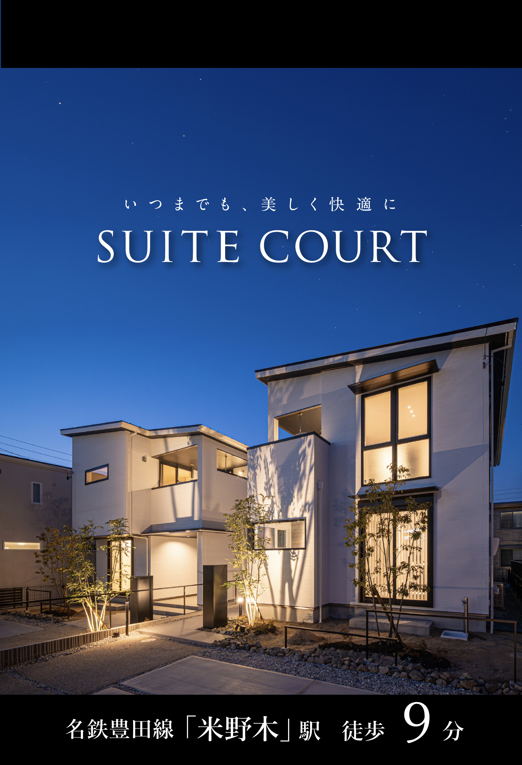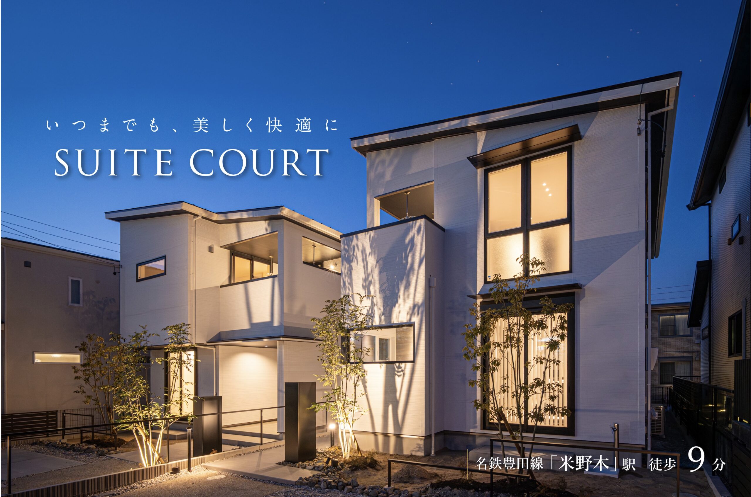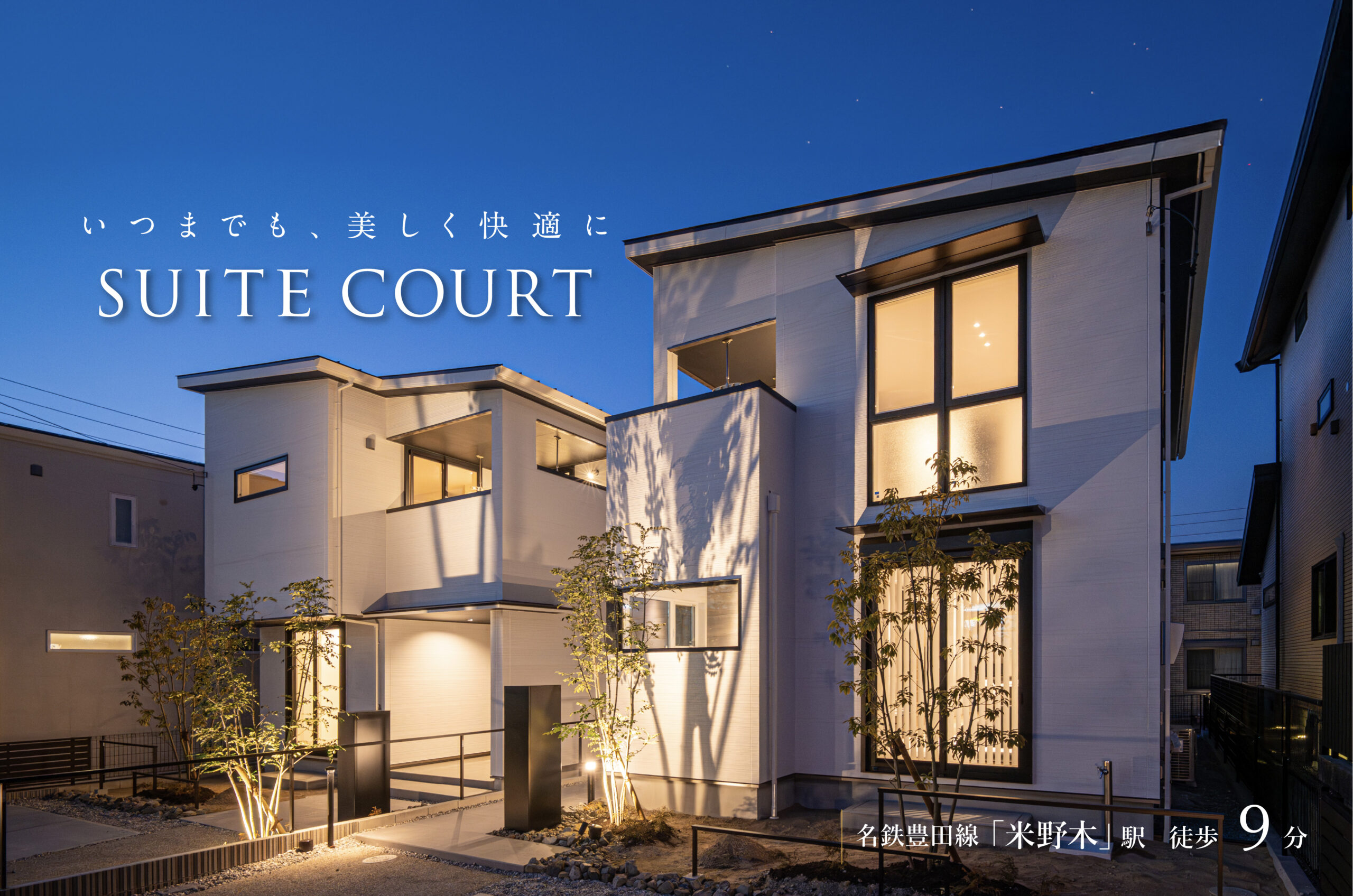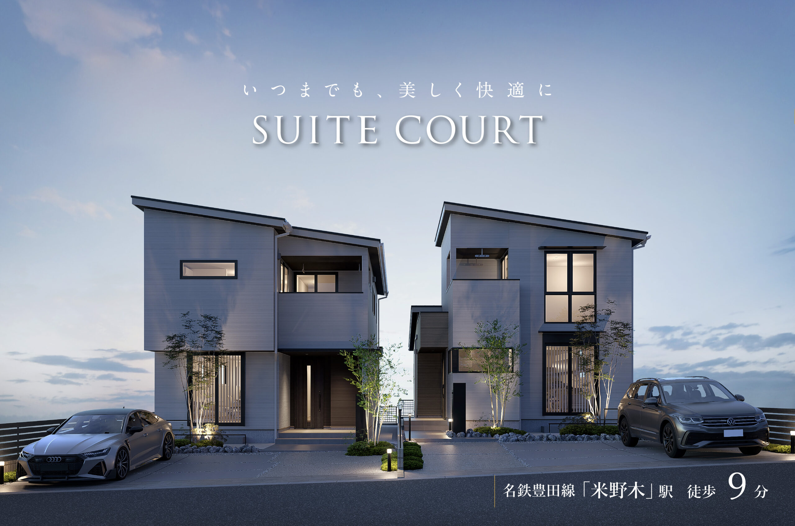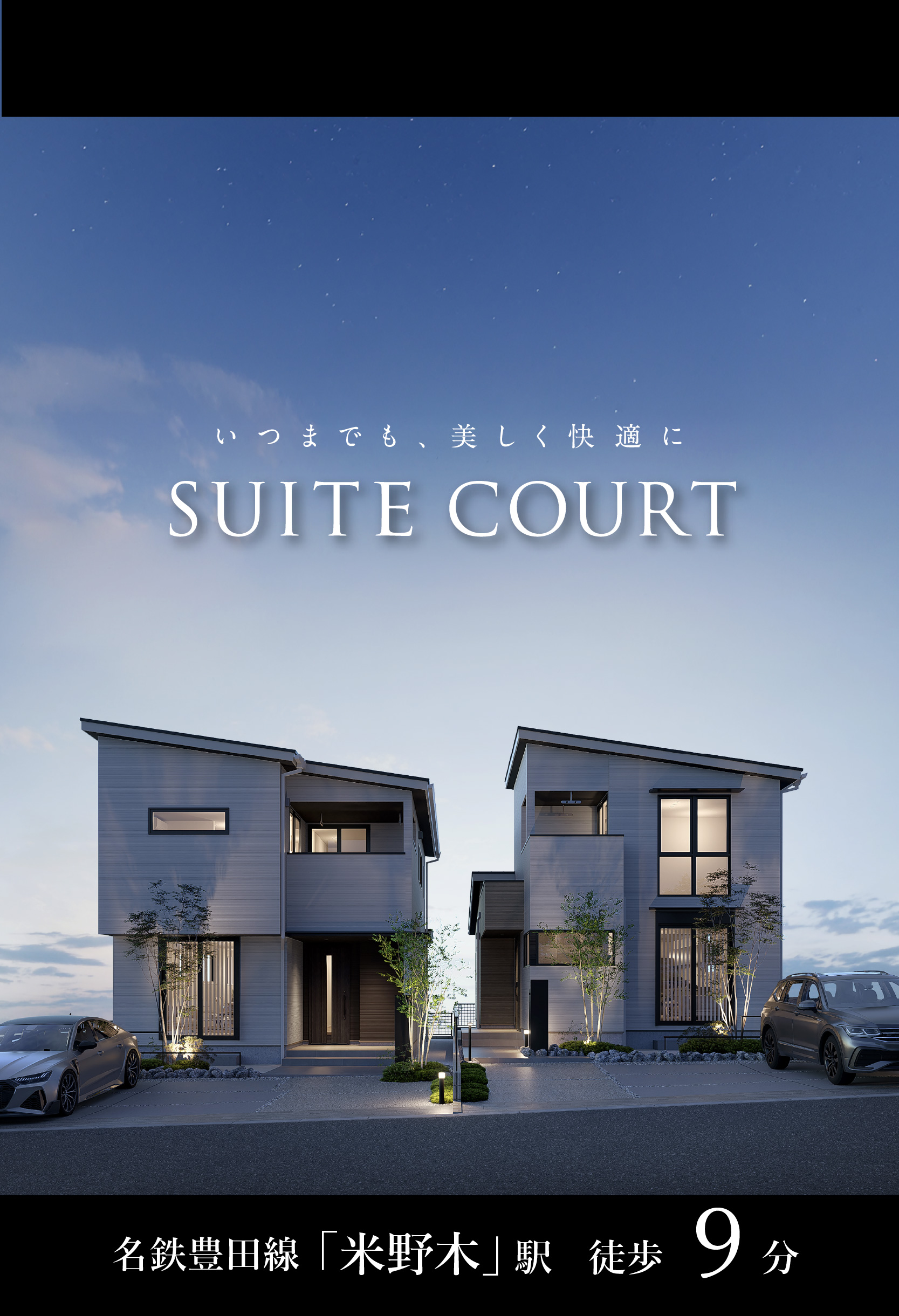 名鉄「米野木」駅徒歩9分。名古屋、豊田方面へアクセス良好。日常に確かな「余裕」をもたらします。未来を見据え、美しく設計された街区には、計画的に整備された道路や公園、静謐な住環境。心地よい安らぎと開放感に満たされたエリアにSUITE COURT誕生。