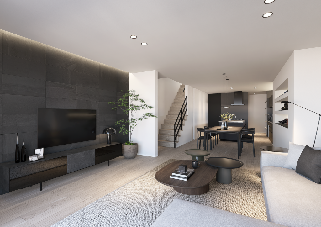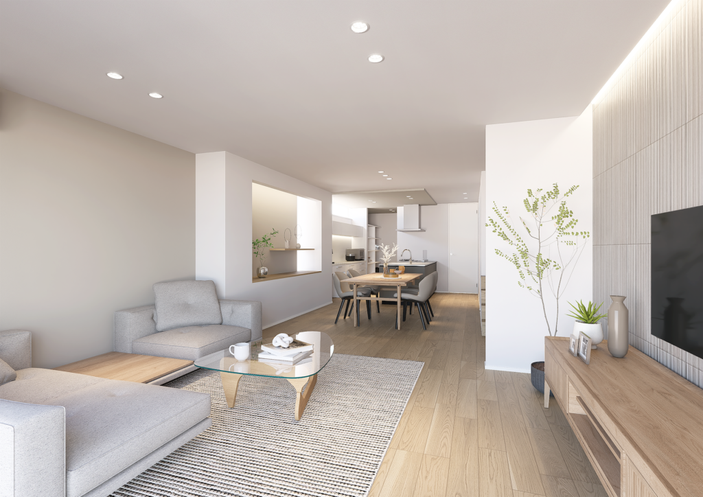 柔らかなベージュと木の温もりに包まれる、開放感あふれるリビング。 計算された照明計画が、夜にはさらに穏やかな奥行きを演出します。