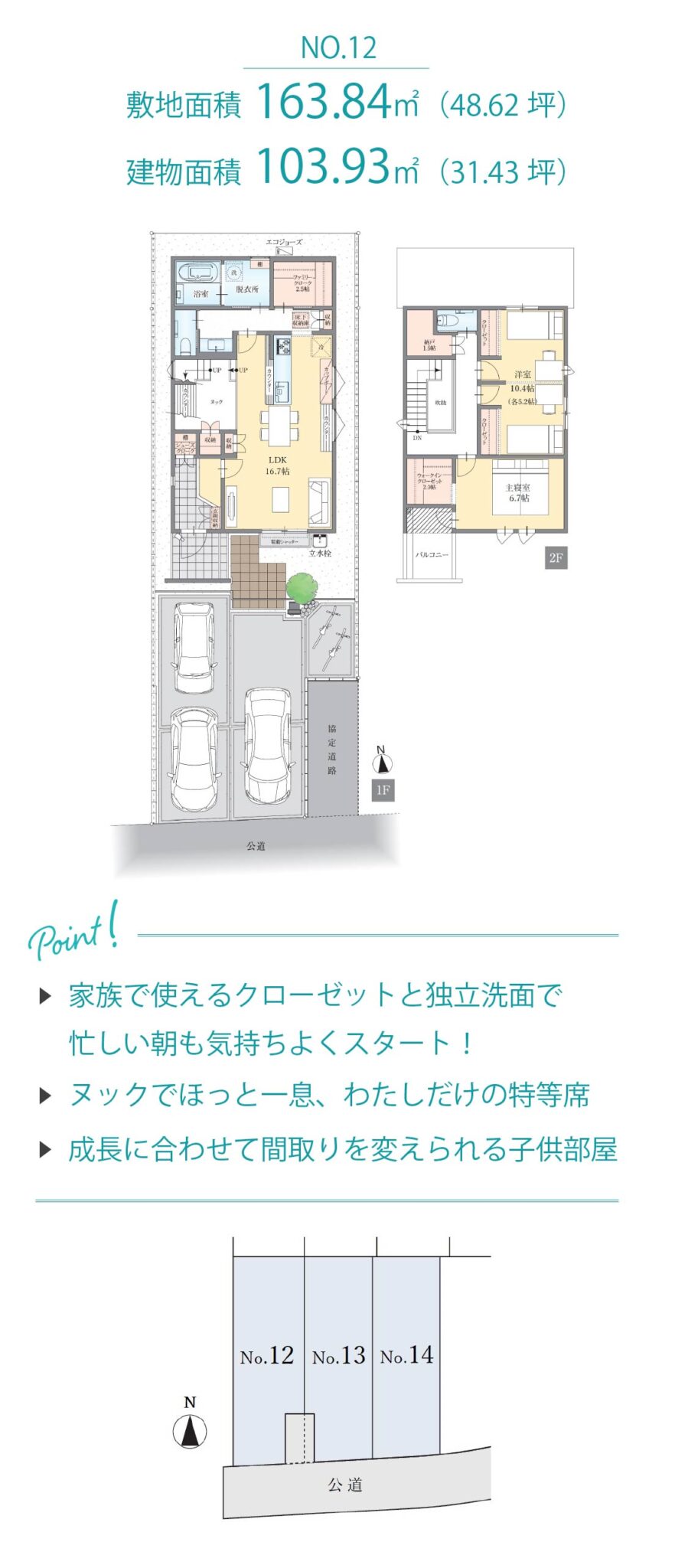 敷地面積 | 146.79m2(44.40坪)~163.84m2(49.56坪) |